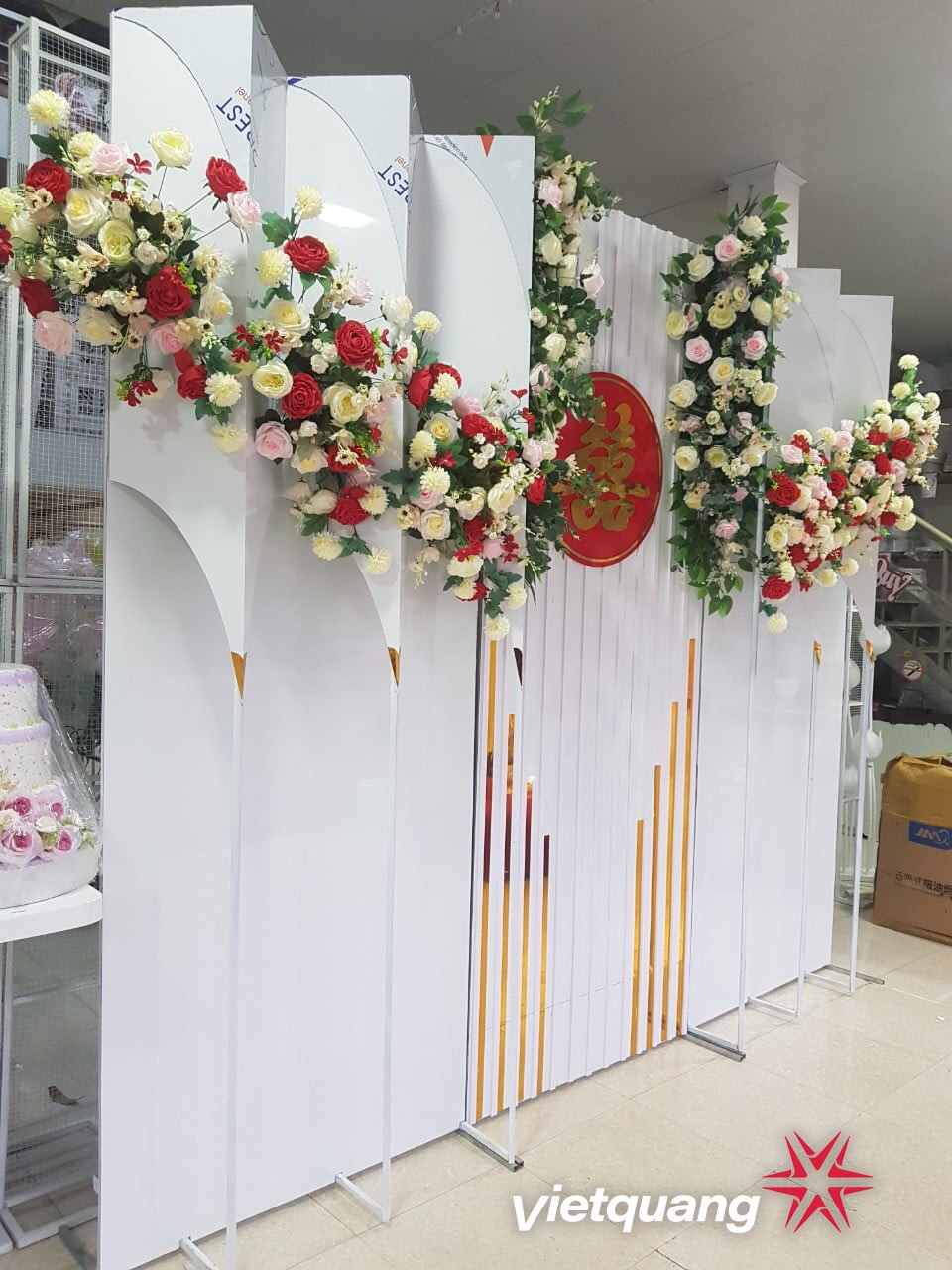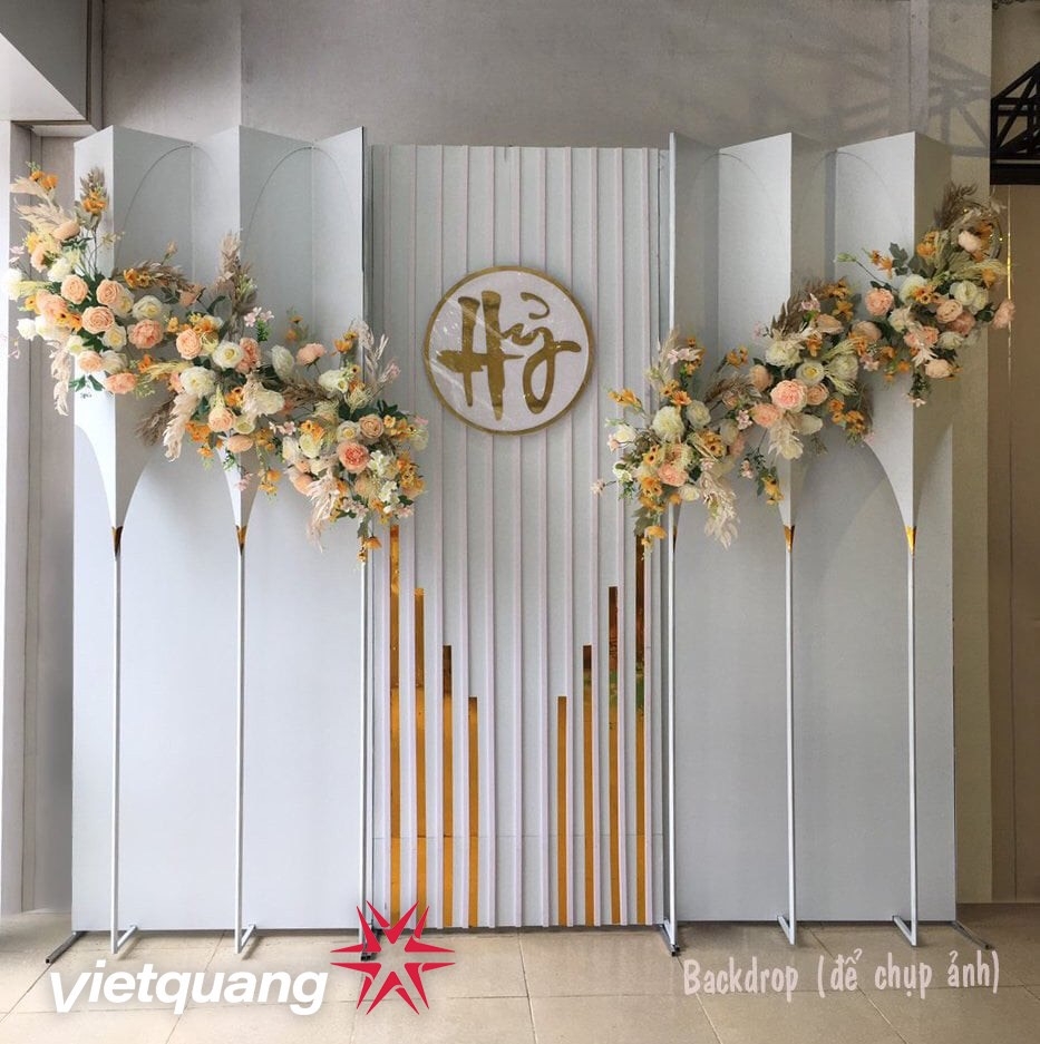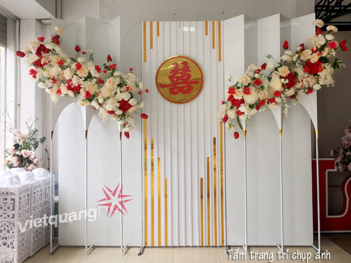 - Chất liệu : Alu bóng 2 ly, khung sắt 14-16, hoa lụa (3-5 loại) cắm theo tông màu cổng.