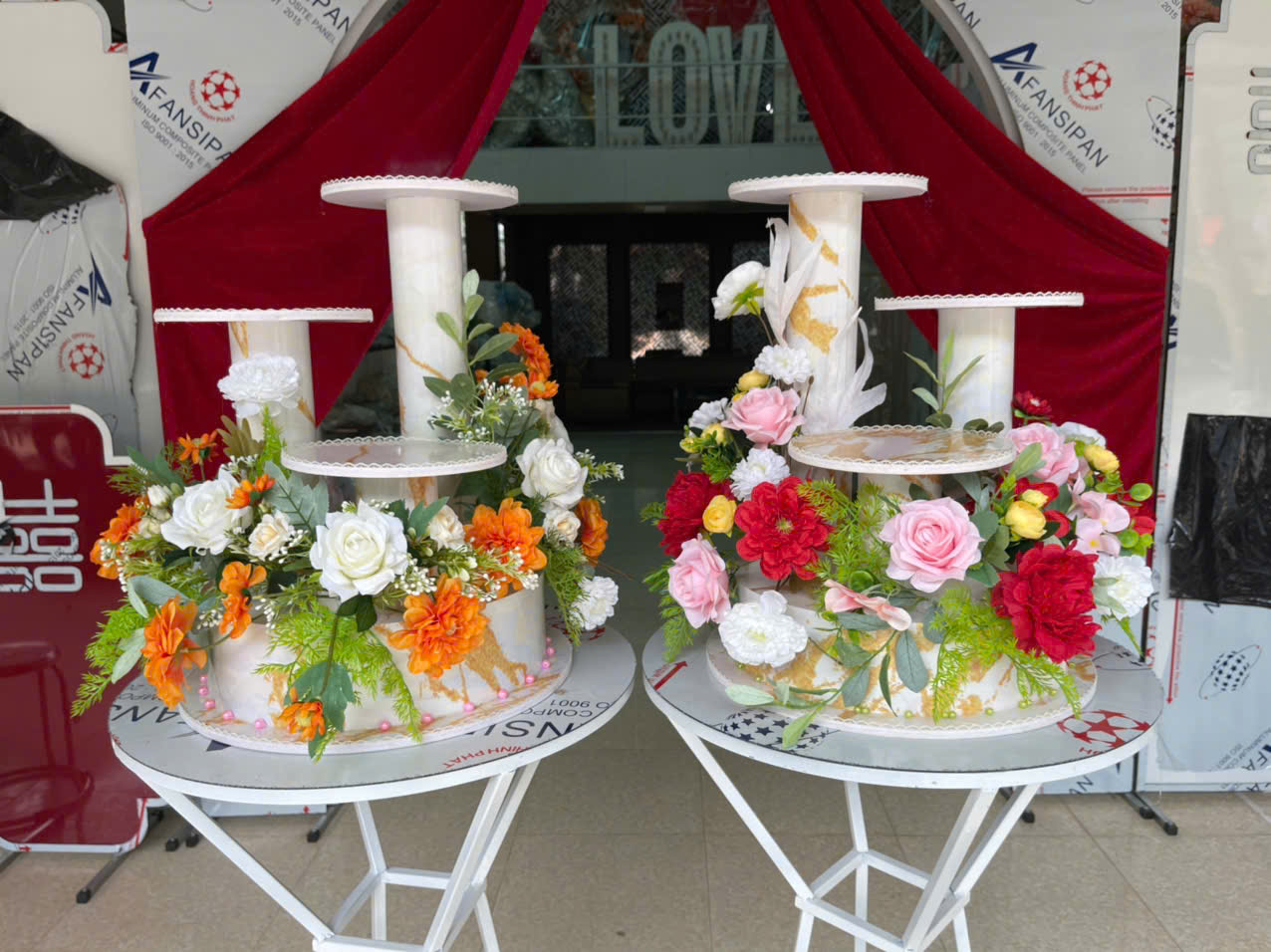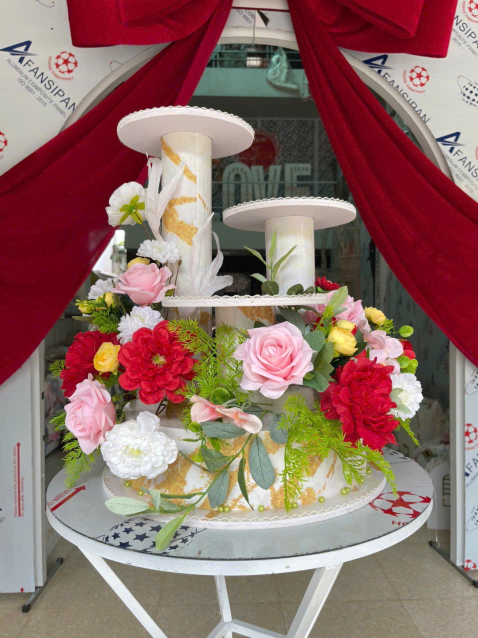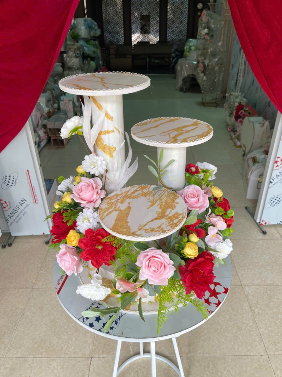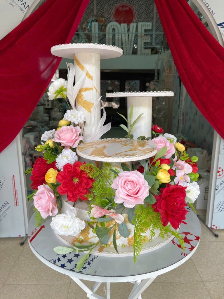 GIÁ ĐỰNG BÁNH KEM 3 TẦNG HOA HỒNG ĐỎ TRẮNG