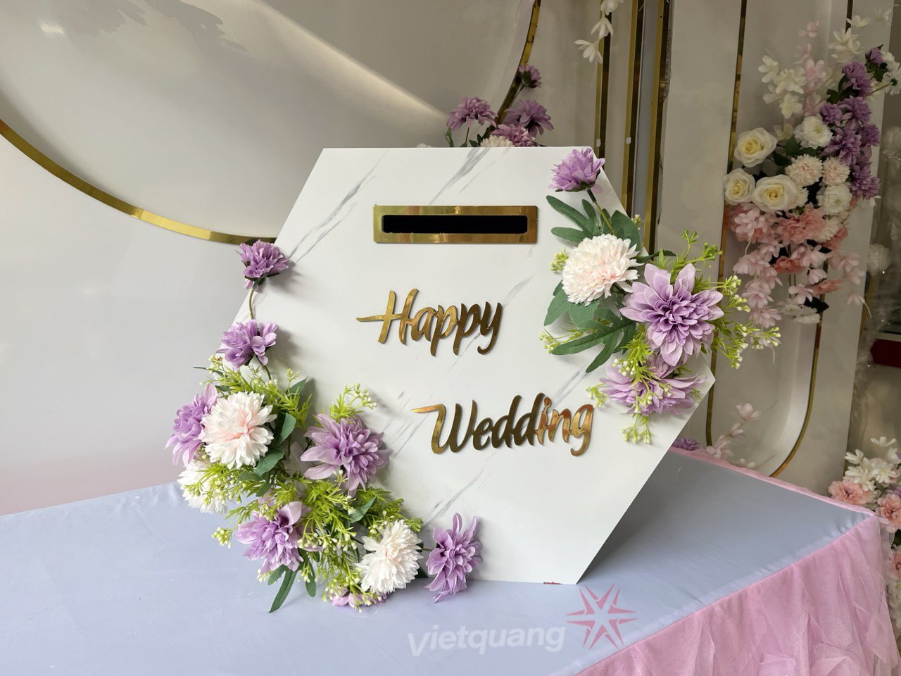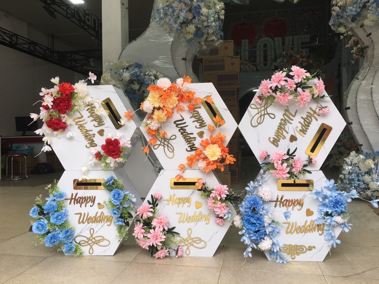 - Chất liệu : Alu, hoa lụa tím trắng, hoa lụa có nhiều màu cắm theo yêu cầu.