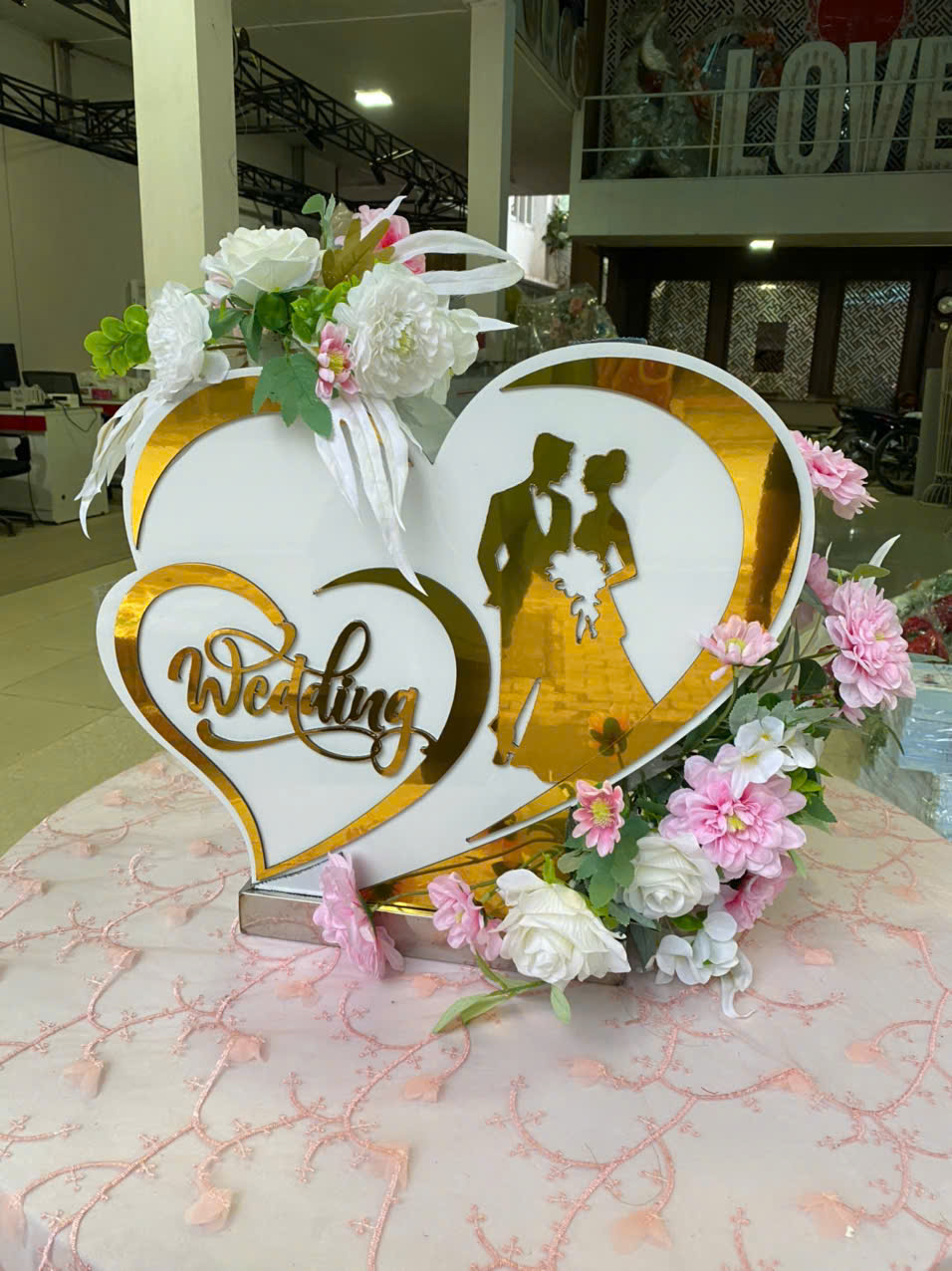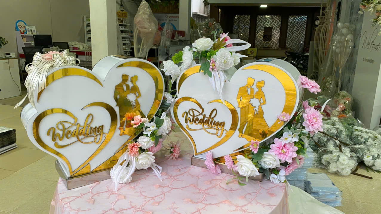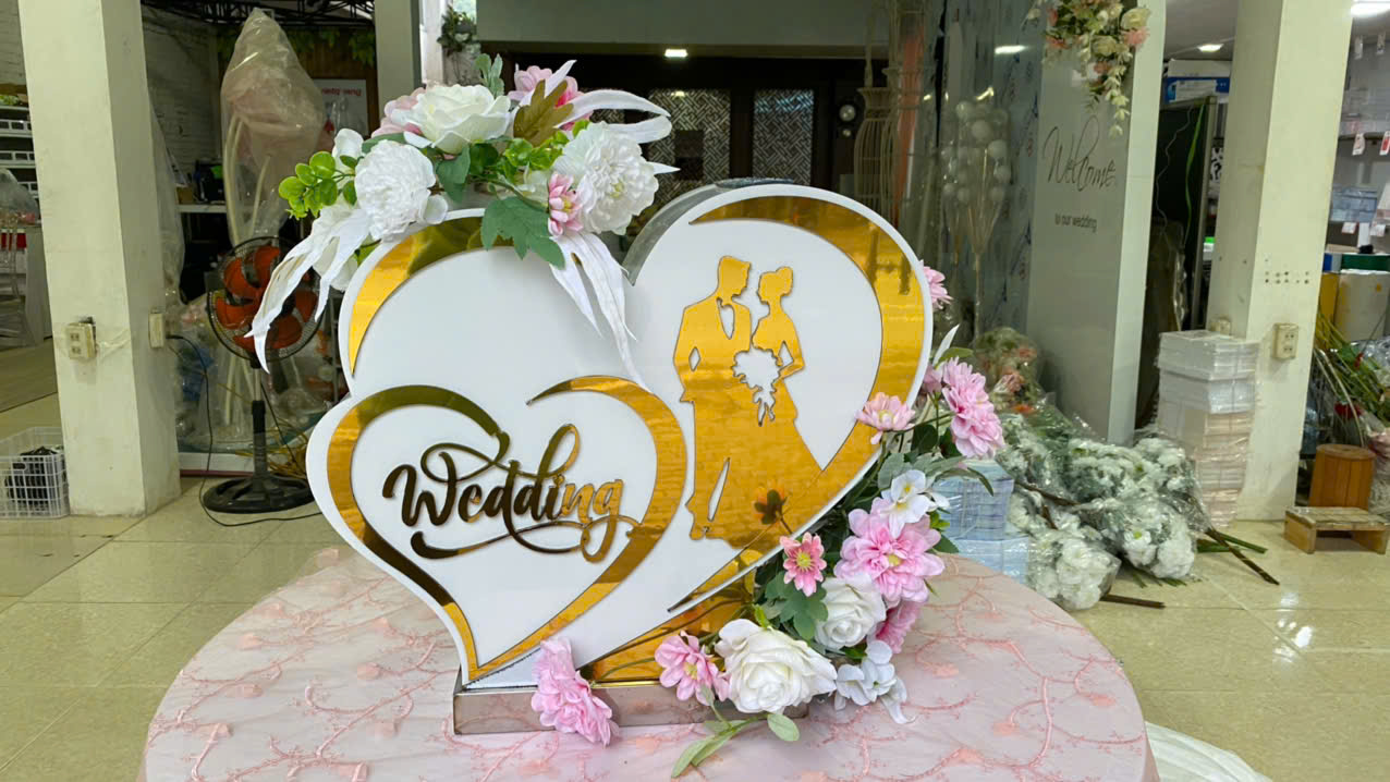 - Chất liệu : Alu gương vàng, hoa màu trắng hồng phấn, hoa lụa có nhiều màu cắm theo yêu cầu.