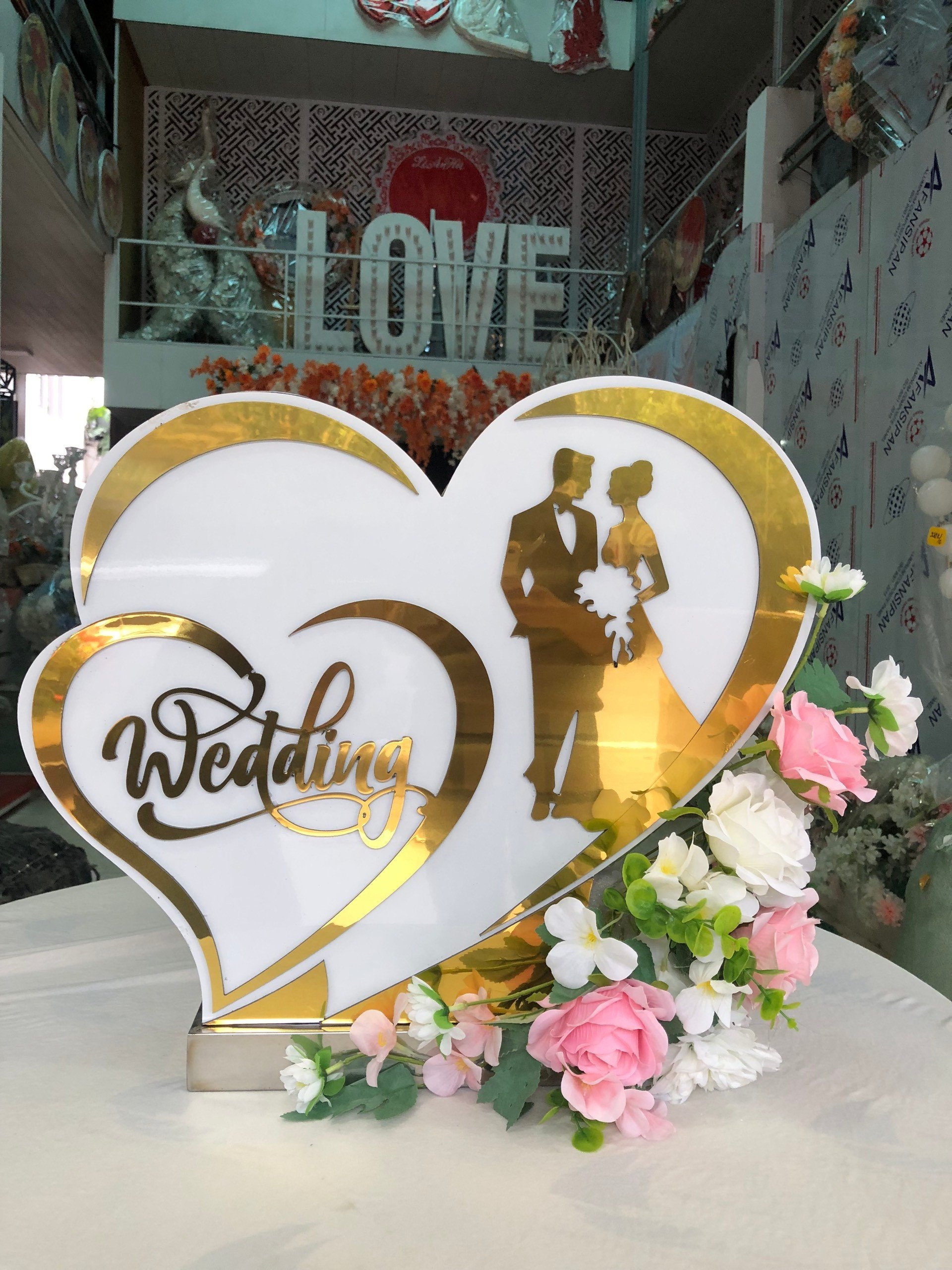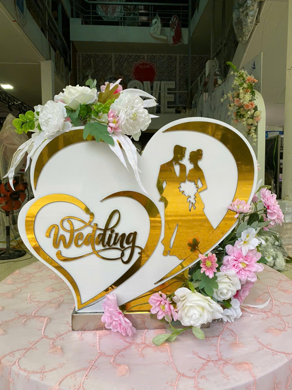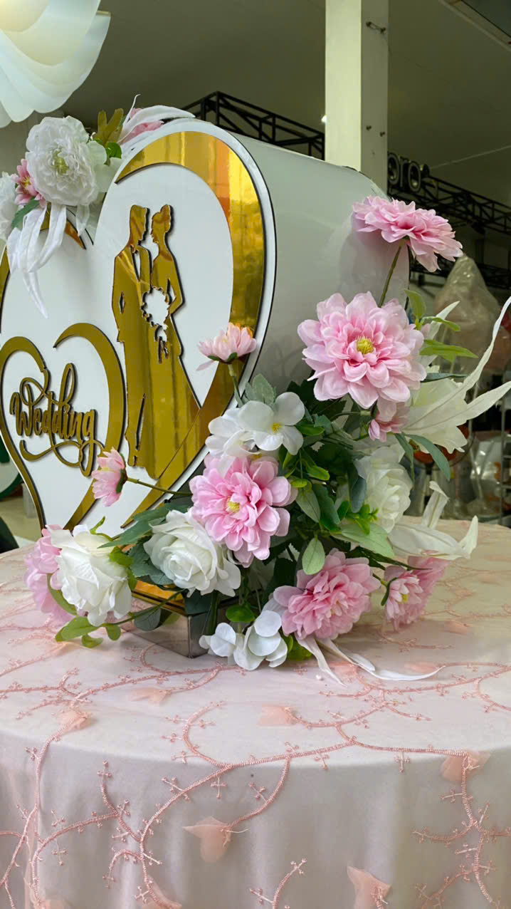 - Chất liệu : Alu gương vàng, hoa màu trắng hồng phấn, hoa lụa có nhiều màu cắm theo yêu cầu.