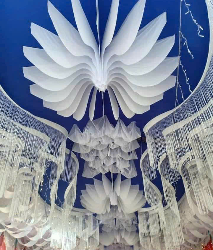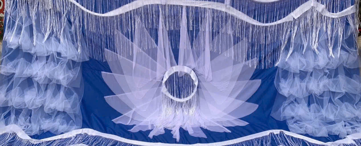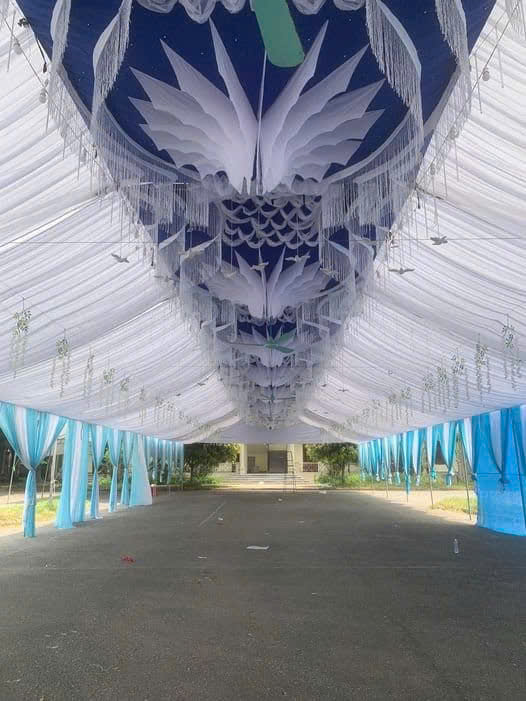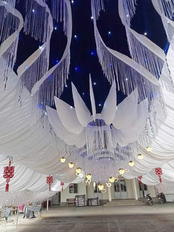 - Chất liệu : Vải nền xanh thô lụa, phần hoa và mây vải lưới loại đẹp, sợi kim tuyến thả.